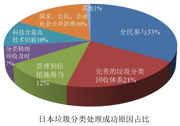 日本的垃圾分類經過四十多年的發(fā)展,至今已擁有了成熟的市場機制、完善的法律體系和完整的回收產業(yè)鏈,日本垃圾處理成功的關鍵與全民參與、完善的回收體系、管理措施、企業(yè)的技術創(chuàng)新以及政府主導密切相關(見餅狀圖),也正因如此,日本在循環(huán)經濟領域一直走在世界前列。