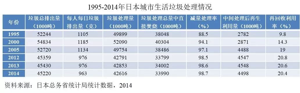 從1995年至2014年日本城市生活垃圾的處理情況看,日本垃圾減量處理率、再回收利用率呈逐年增長趨勢,這主要得益于日本先進的垃圾回收處理技術。