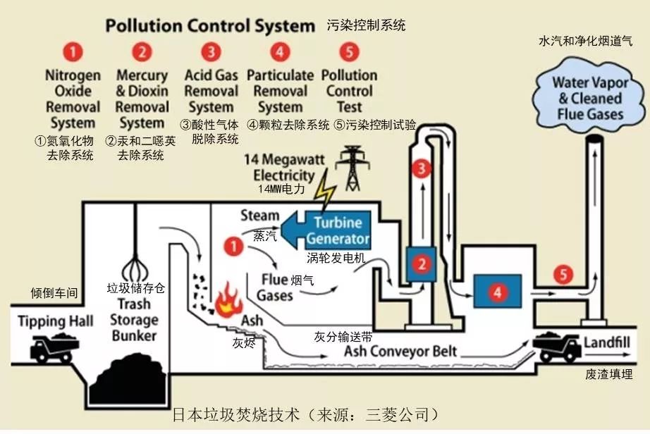 日本的垃圾處理技術主要包括生產廢棄物固體燃料以及垃圾生物降解,80%的生活垃圾通過焚燒處理,填埋僅占1.3%,其它部分通過破碎、分選等方式處理。日本是目前生活垃圾焚燒技術最先進的國家,垃圾焚燒廠的數(shù)量位居世界第一,焚燒爐型主要有爐排爐(下圖是以三菱公司為代表的焚燒技術路線)、流化床焚燒爐和氣化熔融爐。