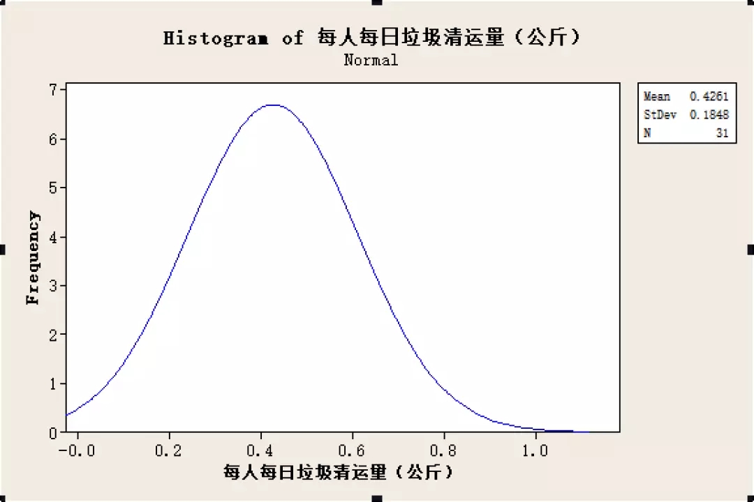 根據(jù)對(duì)每日垃圾清運(yùn)量數(shù)據(jù)的直方圖以及正態(tài)分布圖,可以看出,全國各大省市的每日人均垃圾清運(yùn)量基本符合正態(tài)分布,其中大部分省市的人均每日清運(yùn)量在0.2-0.6公斤之間,平均值為0.42公斤。