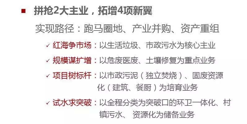 抓住環(huán)保行業(yè)持續(xù)增長(zhǎng)的趨勢(shì)和新興業(yè)務(wù)爆發(fā)式增長(zhǎng)的契機(jī),繼續(xù)以“2+4”業(yè)務(wù)為重點(diǎn),通過(guò)實(shí)施主動(dòng)擴(kuò)張戰(zhàn)略,快速提升市場(chǎng)規(guī)模,確保三年發(fā)展成為“3+3”并力爭(zhēng)向“4+2”業(yè)務(wù)格局轉(zhuǎn)型,并探索業(yè)務(wù)的延伸。