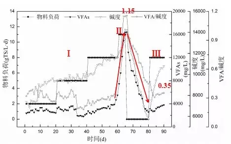 對于反應(yīng)器運行過程中堿度和有機酸濃度的變化,VFA/堿度基本在0.4以內(nèi),表明反應(yīng)器運行較為穩(wěn)定,VFAs、堿度和VFA/堿度均急劇上升。