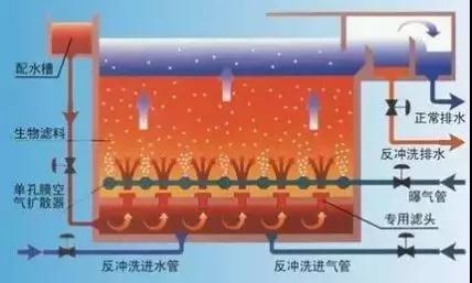 曝氣生物濾池的主要構(gòu)造包括池體、濾料、承托層、布?xì)庀到y(tǒng)、布水裝置、反沖洗裝置、排水系統(tǒng)。