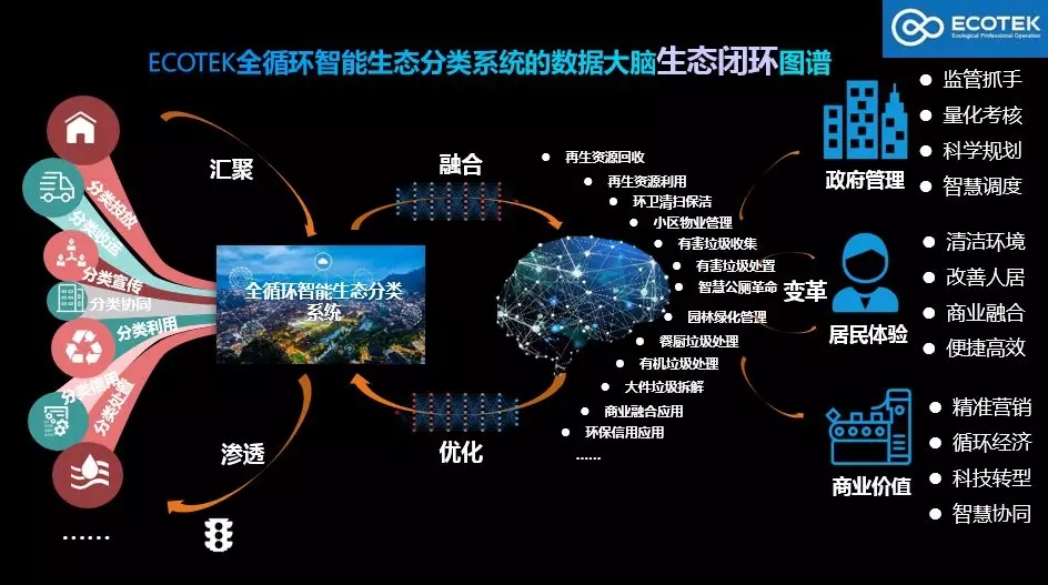 與此同時(shí),行業(yè)技術(shù)從簡(jiǎn)單的設(shè)備應(yīng)用發(fā)展至如今的互聯(lián)網(wǎng)+深度推廣模式。智慧環(huán)衛(wèi)的服務(wù)主體逐步向大眾傾斜,因此,專注于全循環(huán)智能分類的生態(tài)系統(tǒng)(ECOTEK)應(yīng)運(yùn)而生。