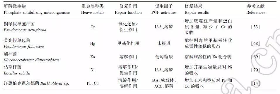 近年來,具有重金屬解毒能力和促進植物生長功能的解磷微生物在土壤重金屬污染修復中被應用和探索, 如表 2 所示。