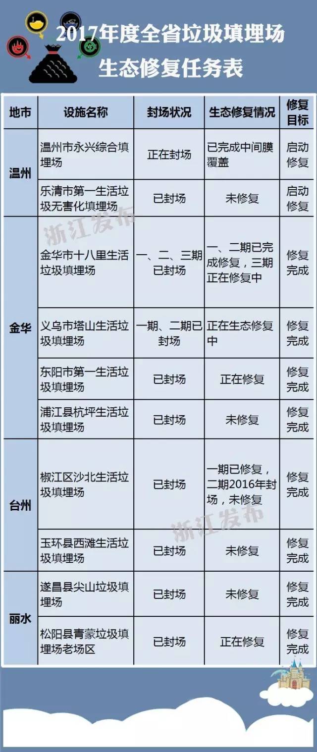 2017年全省計(jì)劃開展10個(gè)垃圾填埋場(chǎng)生態(tài)修復(fù)工程,浙江要通過這些垃圾填埋場(chǎng)的生態(tài)化改造,拆除環(huán)保“定時(shí)炸彈”。具體名單↓
