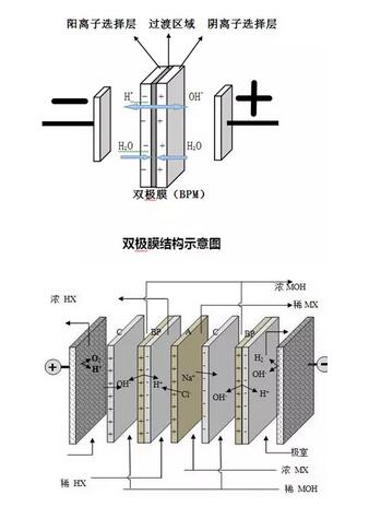 雙極膜亦稱雙極性膜,是特種離子交換膜,它是由一張陽膜和一張陰膜復(fù)合制成的陰、陽復(fù)合膜。該膜的特點是在直流電場的作用下,陰、陽膜復(fù)合層間的H2O解離成H+和OH-并分別通過陰膜和陽膜,作為H+和OH-離子源。在水處理中主要通過離子交換達(dá)到凈化水資源的目的。