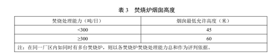 焚燒爐煙囪高度不得低于圖表中規(guī)定的高度,具體高度應(yīng)根據(jù)環(huán)境影響評(píng)價(jià)結(jié)論確定。如果在煙囪周圍200米半徑距離內(nèi)存在建筑物時(shí),煙囪高度應(yīng)至少高出這一區(qū)域內(nèi)最高建筑物3m以上。