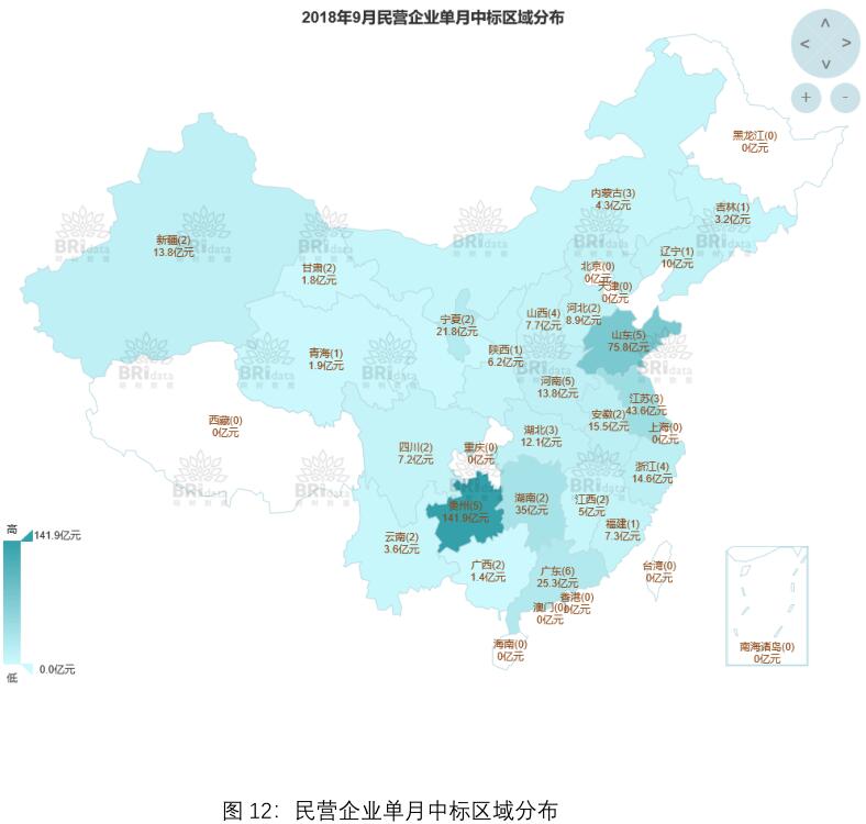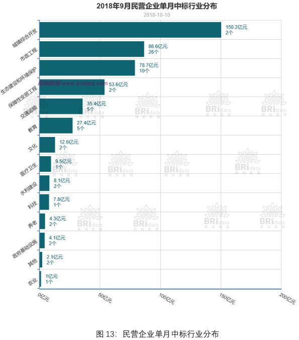 本月民營企業(yè)作為單獨(dú)投標(biāo)方或聯(lián)合體牽頭方共中標(biāo) 63 個項(xiàng)目,合計 481.41 億元,本月民企中標(biāo)項(xiàng)目個數(shù)及項(xiàng)目規(guī)模均較上月有所下降。其中民營企業(yè)中標(biāo)區(qū)域、行業(yè)分布如下圖所示: