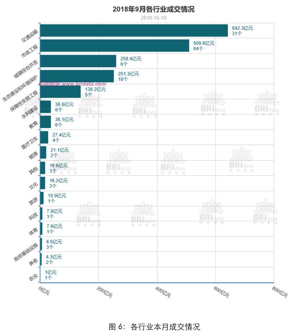 從區(qū)域成交的情況來看,本月四川省、浙江省和貴州省成交的項(xiàng)目金額排名前列,分別成交了 325.1 億元、229.8 億元、210.4 億元。截止至 2018 年 9 月底,河南省落地項(xiàng)目總規(guī)模超過了云南省位列第一,河南省、云南省和四川省占據(jù)了累計實(shí)施 PPP項(xiàng)目金額的前三位。