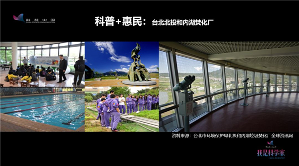 這是在臺北建設(shè)的北投和內(nèi)湖垃圾焚燒廠,這里有環(huán)境教育教室,有游泳池為周邊的居民和周邊的中小學(xué)提供免費(fèi)的游泳服務(wù),有建立在煙囪頂部的旋轉(zhuǎn)餐廳。如果垃圾焚燒廠煙囪里面有污染物質(zhì)超標(biāo)排放,那么餐廳這個位置應(yīng)該是最容易受到污染的,而事實(shí)上排放是達(dá)標(biāo)的。大家可以在這里用餐、休息、觀景,沒有安全的隱患。