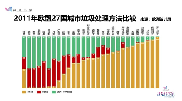 面這張圖解釋了在歐盟的27個國家里面,不同國家垃圾的三種處理方式的比例。