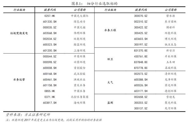 我們選取了垃圾焚燒發(fā)電、水務運營、水務工程、環(huán)衛(wèi)、大氣和監(jiān)測6個細分領域內的代表性上市公司,通過這些上市公司的2017年年報財務數(shù)據(jù)計算細分行業(yè)指標進行比較。