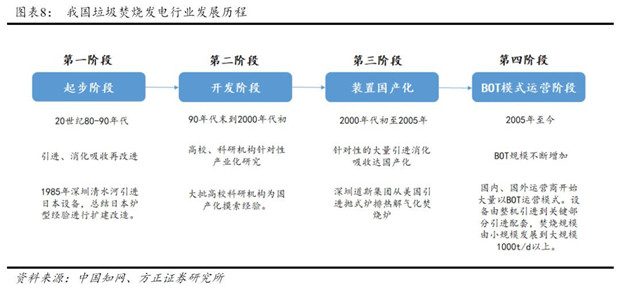 我國垃圾焚燒發(fā)電行業(yè)起步于20世80年代末,通過引進國外先進的焚燒設備和技術,消化吸收優(yōu)化,先后經歷了產業(yè)化研發(fā)、裝置國產化等階段。