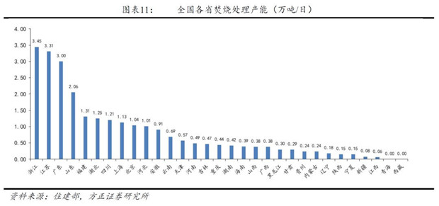 從垃圾焚燒產能角度看,浙江、江蘇、廣東三省垃圾焚燒產能超過3萬噸/日,甘肅、貴州、內蒙古、遼寧、陜西、寧夏、新疆、江西8省垃圾焚燒產能不足3000噸/日,而青海和西藏更是尚無垃圾焚燒項目。