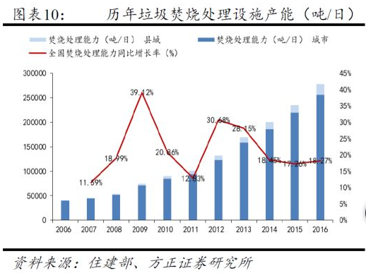 從2005年開始,BOT模式在垃圾焚燒行業(yè)開始大規(guī)模推廣,根據(jù)住建部的統(tǒng)計年鑒,2016年全國生活垃圾焚燒處理設施數(shù)量達到299個,同比增長16.34%;生活垃圾焚燒處理能力達到27.82萬噸/日,同比增長18.28%。2012-2016年年均復合增速20%左右。