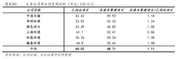 項目投資建設決定了在建工程轉無形資產的賬面價值,通過折舊攤銷間接影響運營期盈利能力,而建設總投資中設備購置占比約50%。比較6家公司單位垃圾處置投資額,偉明環(huán)保最低,上海環(huán)境最高,與設備是否自產和成本管控有關。