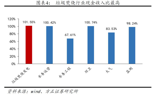 從現(xiàn)金收入比來看,2017年垃圾焚燒發(fā)電現(xiàn)金收入比101.55%,高于其他細分行業(yè),表現(xiàn)出運營類業(yè)務良好的現(xiàn)金流情況。