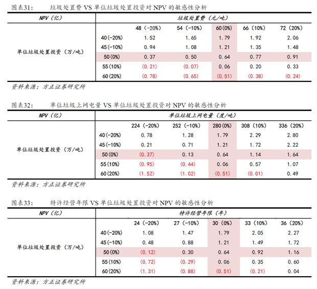 通過敏感性測試,項目NPV影響因素由大到小依次為:單位投資額>單位垃圾上網電量>特許經營期限>垃圾處置費。單位投資額對于項目NPV影響最大,建設期成本管控對于項目整體估值影響最大;其次為單位垃圾上網電量,受到垃圾熱值、焚燒設備效率、自用電比例等因素影響;其次為特許經營年限;最后為垃圾處置費。