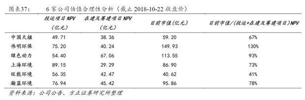 通過(投運項目+在建及籌建項目)NPV/目前市值指標來衡量上市公司目前市值的合理水平。垃圾焚燒項目估值由高到低依次為偉明環(huán)保、綠色動力、瀚藍環(huán)境、上海環(huán)境、中國天楹、旺能環(huán)境。
