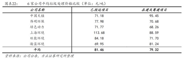 我們根據(jù)上市公司公開披露的項目信息統(tǒng)計,取各個項目垃圾處置價格的平均值,對6家A股上市公司進行比較。已投運項目平均處置價格81元/噸,在建及籌建項目平均處置價格79元/噸,行業(yè)競爭激烈導致行業(yè)整體垃圾處置價格有所下降。