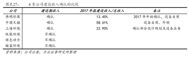 6家上市公司中,綠色動力、上海環(huán)境將保底垃圾處置費確認為金融資產-長期應收款,建設投資剩余部分確認為無形資產-特許經營權;而偉明環(huán)保、中國天楹、旺能環(huán)境、瀚藍環(huán)境將全部建設投資轉入無形資產。