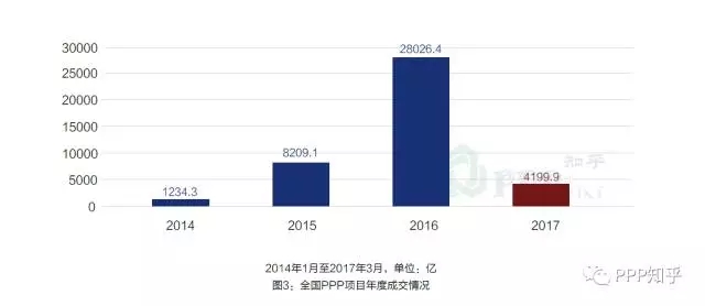 而中國(guó)自2014年以來(lái),根據(jù)PPP知乎和龍?jiān)鞒堑氖袌?chǎng)成交月報(bào)數(shù)據(jù),截止2017年3月31日,大約3年的時(shí)間成交項(xiàng)目總數(shù)就達(dá)到了2579個(gè),累計(jì)金額達(dá)到了4.17萬(wàn)億元,并呈現(xiàn)了明顯的逐年加速態(tài)勢(shì)(參見(jiàn)《2017年3月全國(guó)PPP項(xiàng)目市場(chǎng)動(dòng)態(tài)》)。