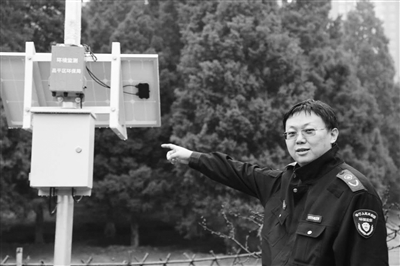 昌平區(qū)環(huán)保局工作人員手指的盒子就是“微站”的核心部件。設(shè)置在昌平公園內(nèi)的這個(gè)實(shí)時(shí)監(jiān)控PM2.5和PM10兩個(gè)因子的微型監(jiān)測(cè)站,可以實(shí)現(xiàn)每一分鐘向系統(tǒng)上傳一次數(shù)據(jù)。 本報(bào)記者童克難攝