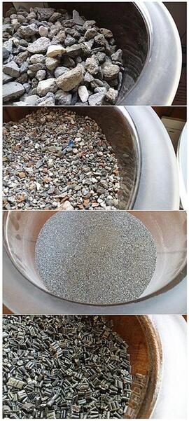 回收后的裝修垃圾,通過(guò)機(jī)器分揀處理,可以生產(chǎn)出不同的原料,自上而下,依次是:大顆粒骨料、小顆粒骨料、粉末骨料和塑料顆粒