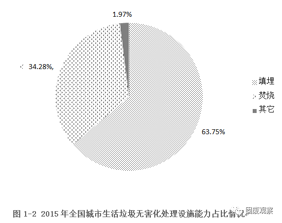 2015年全國城市生活垃圾無害化處理設(shè)施達(dá)到890座,無害化處理量為18013.01萬噸,比上一年分別增長8.8%和9.88%。衛(wèi)生填埋、焚燒依舊是我國采用的垃圾無害化處理兩種主要方式。其中,衛(wèi)生填埋640座,比上一年增加36座,無害化年處理量為11483.14萬噸,比上一年增加6.88%。生活垃圾焚燒廠220座,比上一年增加32座,無害化年處理量為6175.52萬噸,比上一年大幅增加15.87%。其他類型處理設(shè)施30座,比上一年增添4座,無害化年處理量為354.35萬噸,比2014年增加10.88%。填埋、焚燒分別占總無害化處理量的63.74%、34.28%,“十二五”期間,填埋處理總量比例持續(xù)小幅下降,焚燒廠數(shù)量和處理能力持續(xù)保持明顯上升,其他類型處理方式一直未有突破性發(fā)展。