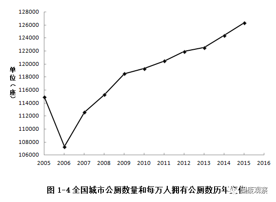 2015年全國城市公共廁所數(shù)量共有126344座,其中三類以上廁所93541座,比2014年分別增長1.5%和0.49%;三類以上公共廁所占全部公共廁所數(shù)量比例由2014年74.83%略微減少至74.04%。目前公廁數(shù)量最多的省份為江蘇、廣東、浙江、河南、黑龍江、河北、上海、山東、北京、遼寧等省。