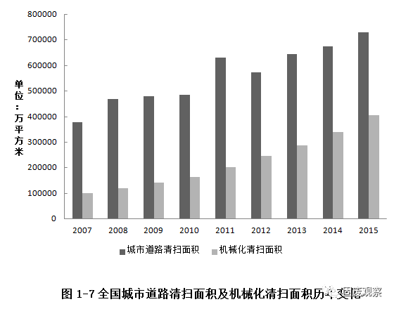 2015年全國城市道路清掃面積730333萬平方米,其中機(jī)械化清掃面積405569萬平方米,占全部清掃面積55.53%。全國城市道路清掃面積累計(jì)比2014年增加8%,機(jī)械化清掃面積比2014年增長18.9%,道路機(jī)械清掃作業(yè)率繼續(xù)顯著提高。