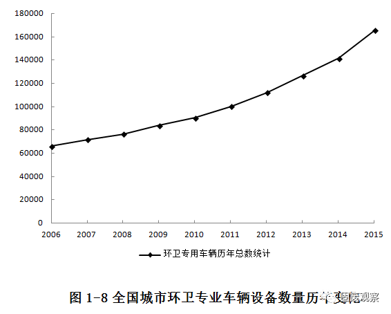 2015年全國城市環(huán)衛(wèi)專用車輛設(shè)備總數(shù)達(dá)到165725臺(輛),比2014年增加24294臺(輛),增長率達(dá)到17.18%。2006至2015年的10年期間,環(huán)衛(wèi)專用車輛總數(shù)平均年增長率達(dá)到8.51%,持續(xù)保持高速增長。