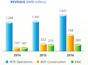 截止2016年12月底,公司已在中國的12個省、自治區(qū)額直轄市已運行了19家垃圾焚燒發(fā)電廠,運營日處理垃圾能力總計27430噸,裝機容量達(dá)469MW。2016年垃圾處理量增加17.4%達(dá)到813噸,實現(xiàn)了2016年稅前利潤和稅后利潤分別達(dá)到29.0%和32.3%的高增長,2016年實現(xiàn)歸屬股東的凈利潤為5.98億元,同比增長34.7%。