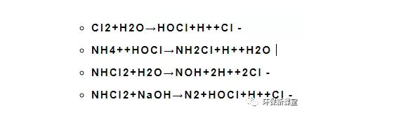 折點(diǎn)加氯法處理后的出水在排放前一般需要用活性碳或二氧化硫進(jìn)行反氯化,以去除水中殘留的氯。1mg殘留氯大約需要0.9~1.0mg的二氧化硫。在反氯化時(shí)會產(chǎn)生氫離子,但由此引起的pH值下降一般可以忽略,因此去除1mg殘留氯只消耗2mg左右(以CaCO3計(jì))。折點(diǎn)氯化法除氨機(jī)理如下: