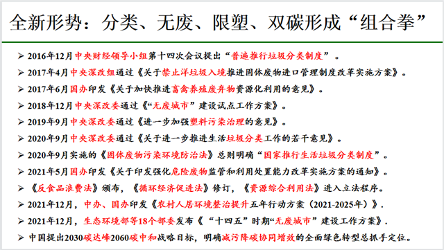 日前,環(huán)境商會組織召開環(huán)衛(wèi)產(chǎn)業(yè)研討會,特邀清華大學(xué)劉建國教授出席。會上,劉建國詳細(xì)分析了當(dāng)前固廢行業(yè)形勢。 劉建國表示,目前固廢行業(yè)整體面臨全新形勢。一是分類、無廢、限塑、雙碳將形成“組合拳”。 劉建國指出,從2000年提出垃圾分類到現(xiàn)在,垃圾分類和20多年前有很大不同:過去...