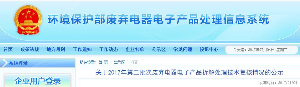 7月4日環(huán)保部環(huán)境保護(hù)部處理管理信息系統(tǒng)發(fā)布了《關(guān)于2017年第二批次廢棄電器電子產(chǎn)品拆解處理技術(shù)復(fù)核情況的公示》,具體內(nèi)容如下:關(guān)于2017年第二批次廢棄電器電子產(chǎn)品拆解處理技術(shù)復(fù)核情況的公示根據(jù)廢棄電器電子產(chǎn)品(以下簡稱廢電器)拆解處理數(shù)量審核程序的有關(guān)規(guī)定,截止2017年1月底,24個(gè)省、自治...