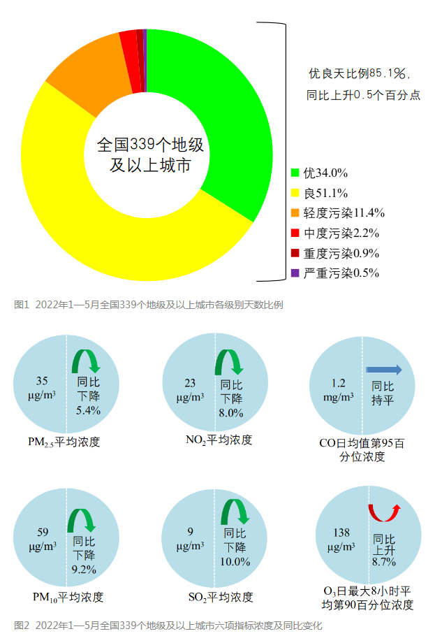 生態(tài)環(huán)境部今日向媒體通報(bào)了2022年5月和1—5月全國(guó)環(huán)境空氣質(zhì)量狀況。 環(huán)境空氣總體情況 2022年5月,全國(guó)339個(gè)地級(jí)及以上城市平均空氣質(zhì)量?jī)?yōu)良天數(shù)比例為85.2%,同比下降2.6個(gè)百分點(diǎn);PM2.5平均濃度為22微克/立方米,同比持平;PM10平均濃度為45微克/立方米,同比下降...