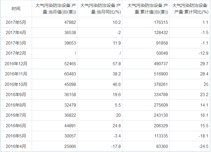 今年是“”第一階段的收官年。在國家政策與一系列舉措的高壓下,我國大氣污染治理情況取得了不小的成績(jī),環(huán)保裝備也迎來難得發(fā)展良機(jī),2021年產(chǎn)量將達(dá)到64.4萬臺(tái)。數(shù)據(jù)顯示,2017年5月我國產(chǎn)量47882臺(tái),當(dāng)月同比上漲10.2%,1-5月累計(jì)產(chǎn)量176315臺(tái),累計(jì)同比上漲1.1%。預(yù)計(jì)2017年中...