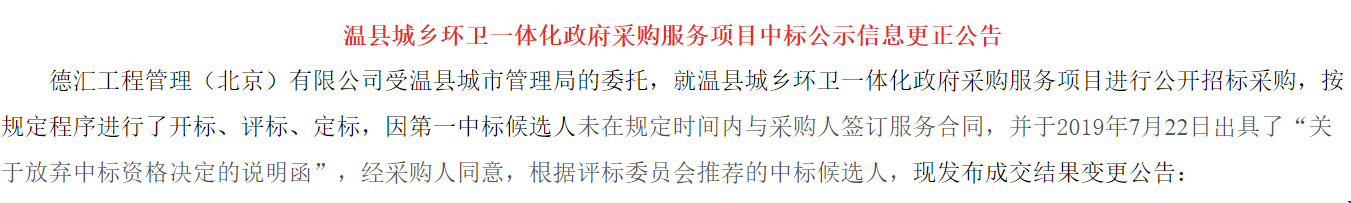 7月30日,河南省焦作市溫縣城鄉(xiāng)環(huán)衛(wèi)一體化項目中標(biāo)信息更正公告發(fā)布,因第一中標(biāo)候選人錦江生態(tài)未在規(guī)定時間內(nèi)與采購人簽訂服務(wù)合同,并在7月22日出具了“關(guān)于放棄中標(biāo)資格決定的說明函”,經(jīng)采購人同意,中標(biāo)供應(yīng)商由錦江生態(tài)變更大連明日環(huán)境,中標(biāo)價格也由5042元/年,變?yōu)?165元/年。具體如下:原中標(biāo)信...