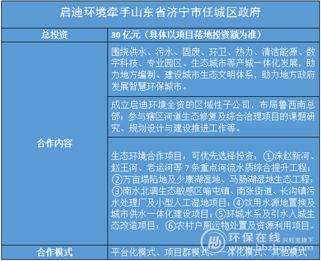 近日,啟迪環(huán)境公告稱公司與山東省濟(jì)寧市任城區(qū)政府簽署合作框架協(xié)議,雙方將對生態(tài)體系建設(shè)重點項目進(jìn)行合作,包括河流水質(zhì)綜合提升工程、濕地生態(tài)工程、飲用水源地置換及城市供水一體化建設(shè)項目等6個生態(tài)環(huán)境項目,預(yù)計總投資約30億元。具體如下圖: 任城區(qū)是山東濟(jì)寧市的核心區(qū),能源富集,產(chǎn)業(yè)發(fā)達(dá),目前正籌備構(gòu)建...