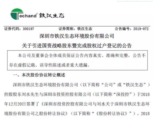 近日,鐵漢生態(tài)發(fā)布公告稱,公司關(guān)于引進國資戰(zhàn)略股東事項已完成股權(quán)過戶登記。權(quán)益變動后,劉水先生持有上市公司股權(quán)的比例由35.73%下降至30.73%,公司的控股股東、實際控制人未發(fā)生變化。近日,鐵漢生態(tài)發(fā)布公告稱,公司關(guān)于引進國資戰(zhàn)略股東事項已完成股權(quán)過戶登記。于2019年4月30日收到中國證券登記...