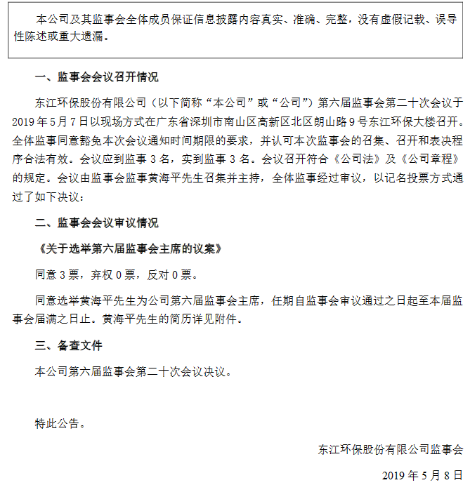 東江環(huán)保公布,公司第六屆監(jiān)事會第二十次會議于2019年5月7日召開,同意選舉黃海平為公司第六屆監(jiān)事會主席,任期自監(jiān)事會審議通過之日起至本屆監(jiān)事會屆滿之日止。東江環(huán)保股份有限公司第六屆監(jiān)事會第二十次會議決議公告