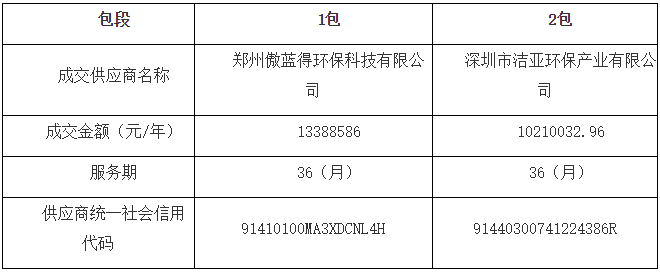 湖北省監(jiān)利縣城區(qū)環(huán)衛(wèi)作業(yè)市場化項目發(fā)布評標(biāo)結(jié)果公示,鄭州傲藍(lán)得環(huán)??萍加邢薰精@得1包,中標(biāo)金額1339萬/年,服務(wù)期限36個月。 具體中標(biāo)信息如下: 附項目信息: 服務(wù)內(nèi)容:監(jiān)利城區(qū)清掃保潔、生活垃圾收集運輸、公廁保潔維護(hù)、水域保潔、中轉(zhuǎn)站管理、牛皮癬清理。 第1包: (1)項目包編號:1包 (2...