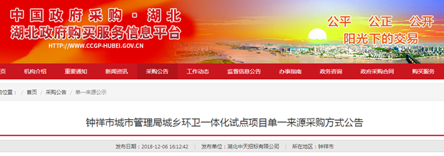 2018年12月6日,湖北省鐘祥市城鄉(xiāng)環(huán)衛(wèi)一體化試點項目發(fā)布單一來源采購方式公告,擬選擇單一來源供應(yīng)商為中國光大生態(tài)資源(香港)有限公司,項目預(yù)算2262萬/年。 據(jù)悉,項目的服務(wù)范圍以鐘祥市所轄的5個鄉(xiāng)鎮(zhèn)為試點(包括:舊口鎮(zhèn)、柴湖鎮(zhèn)、長灘鎮(zhèn)、九里鄉(xiāng)、東橋鎮(zhèn))共計147個行政村,主要內(nèi)容包括農(nóng)村鎮(zhèn)區(qū)...