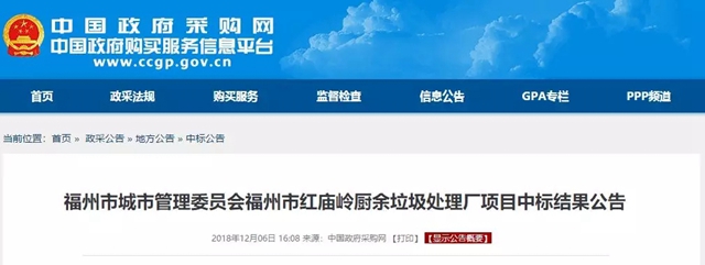 日前,從中國政府采購網(wǎng)獲悉,福建首個廚余垃圾處理PPP項目--福州市紅廟嶺廚余垃圾處理廠項目(以下簡稱福州項目)中標(biāo)結(jié)果出爐,首創(chuàng)環(huán)境控股有限公司聯(lián)合體以261元/噸中標(biāo)價成功將項目攬入懷中。 福州項目是福州市垃圾分類的終端處理設(shè)施——紅廟嶺循環(huán)經(jīng)濟生態(tài)產(chǎn)業(yè)園區(qū)的重要組成部分...