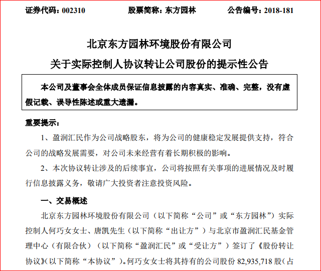 12月9日,東方園林發(fā)布公告,公司實際控制人何巧女、唐凱與北京市盈潤匯民基金管理中心(簡稱“盈潤匯民”)簽訂了《股份轉(zhuǎn)讓協(xié)議》。 根據(jù)協(xié)議,何巧女將其持有的公司股份 82,935,718 股(占公司總股本的 3.09%)、唐凱將其持有的公司股份 51,337,383 股(占公...