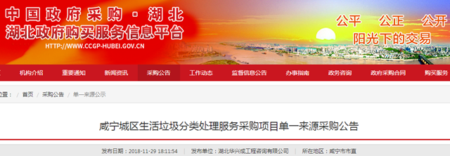 湖北咸寧城區(qū)生活垃圾分類處理服務采購項目發(fā)布單一來源采購公告,擬選擇啟迪桑德環(huán)境資源股份有限公司為單一來源供應商,項目預算500萬。 據悉,2016年10月,咸寧市人民政府授權咸寧市城市管理執(zhí)法局與啟迪桑德環(huán)境資源股份有限公司簽訂了《咸寧市城區(qū)環(huán)衛(wèi)作業(yè)PPP項目特許經營權協議》。 城市生活垃圾分類收...