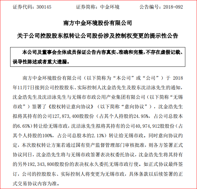 中金環(huán)境公告,公司控股股東、實(shí)際控制人沈金浩及股東沈潔泳與無(wú)錫市市政公用產(chǎn)業(yè)集團(tuán)有限公司(以下簡(jiǎn)稱“無(wú)錫市政”)簽署《股權(quán)轉(zhuǎn)讓意向協(xié)議》。 沈金浩擬將其持有的公司127,873,400股股份(占其個(gè)人持股的24.95%,占公司總股本的6.65%)轉(zhuǎn)讓給無(wú)錫市政,沈潔泳擬將其持...