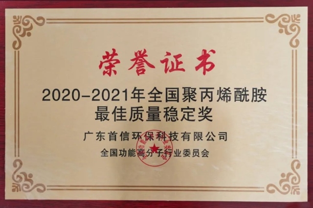 2020-2021年全國聚丙烯酰胺最佳質(zhì)量穩(wěn)定獎已出爐,本次獲得該項榮譽的是——廣東首信環(huán)保材料科技有限公司。可喜、可賀、更可嘆!首信環(huán)保獲全國聚丙烯酰胺最佳質(zhì)量穩(wěn)定獎 事實上,廣東首信環(huán)保材料科技有限公司(下稱“首信環(huán)保”)已經(jīng)不是第一次獲得該項榮譽...